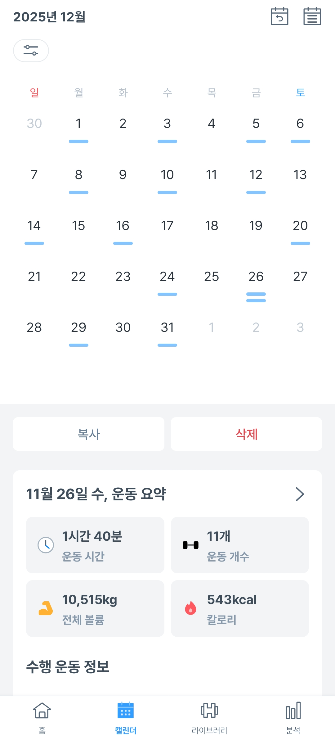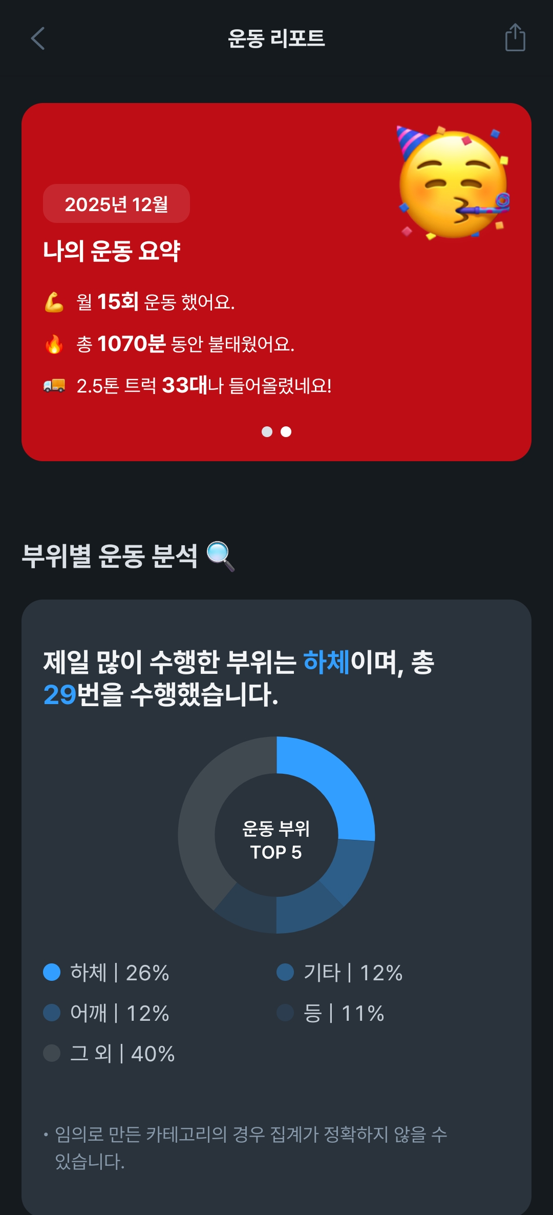 언제 어떤 운동을 했는지 캘린더에서 한눈에 확인 가능! 운동 패턴을 파악하고 꾸준함을 유지하는 데 큰 도움이 됩니다. 루틴별, 부위별 필터 기능으로 내가 원하는 기록만 쏙쏙 볼 수 있어요.